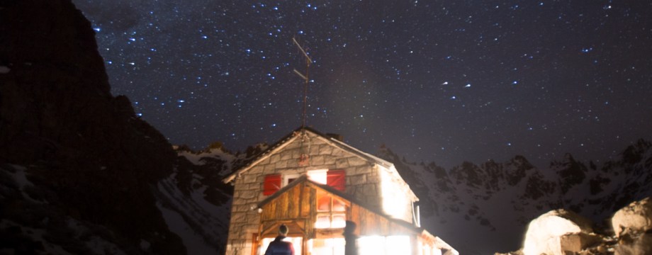 By the end of the afternoon a bunch of more people showed up, probably because of the good conditions for trekking and the allure of some freshies. Thankfully we had done our best to track the couloirs out! Our tight knit group of 7 was suddenly sharing the same space with 20 more people! The entire operation was run amazingly efficiently as Vasco and another refugiero whipped up enough pizzas and pasta to feed everyone. Those guys are incredible! One of the groups that arrived was a guided tour of 6 Americans and Canadians who were accompanied by two pro skiers: Eric Hjorleifson and Chris Rubens. It was cool hanging out with the two pros, they were very down to earth and I didn’t even realize who they were for awhile as we talked about Argentina, skiing and surfing. I also played a few games of chess and won my first two, which made me el champeon until the point that Vasco caught wind of my success and challenged me. He handidly beat me within about 25 moves. Later in the evening Vincenz had the cool idea of taking some long exposure photos to capture the images of the stars and Milky Way. During the 30 second exposure one person would run out in front of the camera and pose while someone else would quickly shine a light on them for a few seconds, which made for some cool shots.