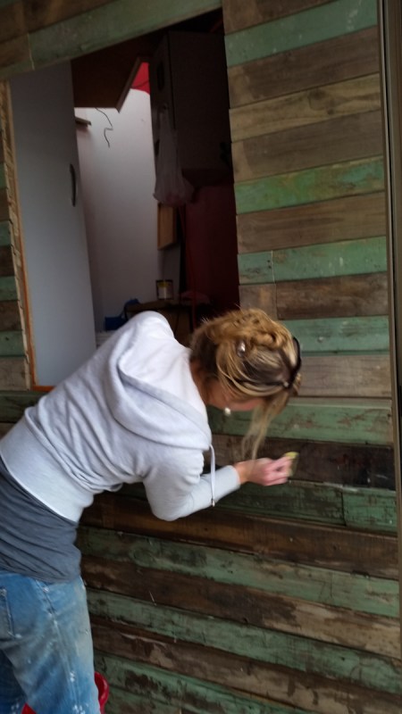 They used salvaged wood for one wall in there shop and here Matti is cleaning it before applying a finish.