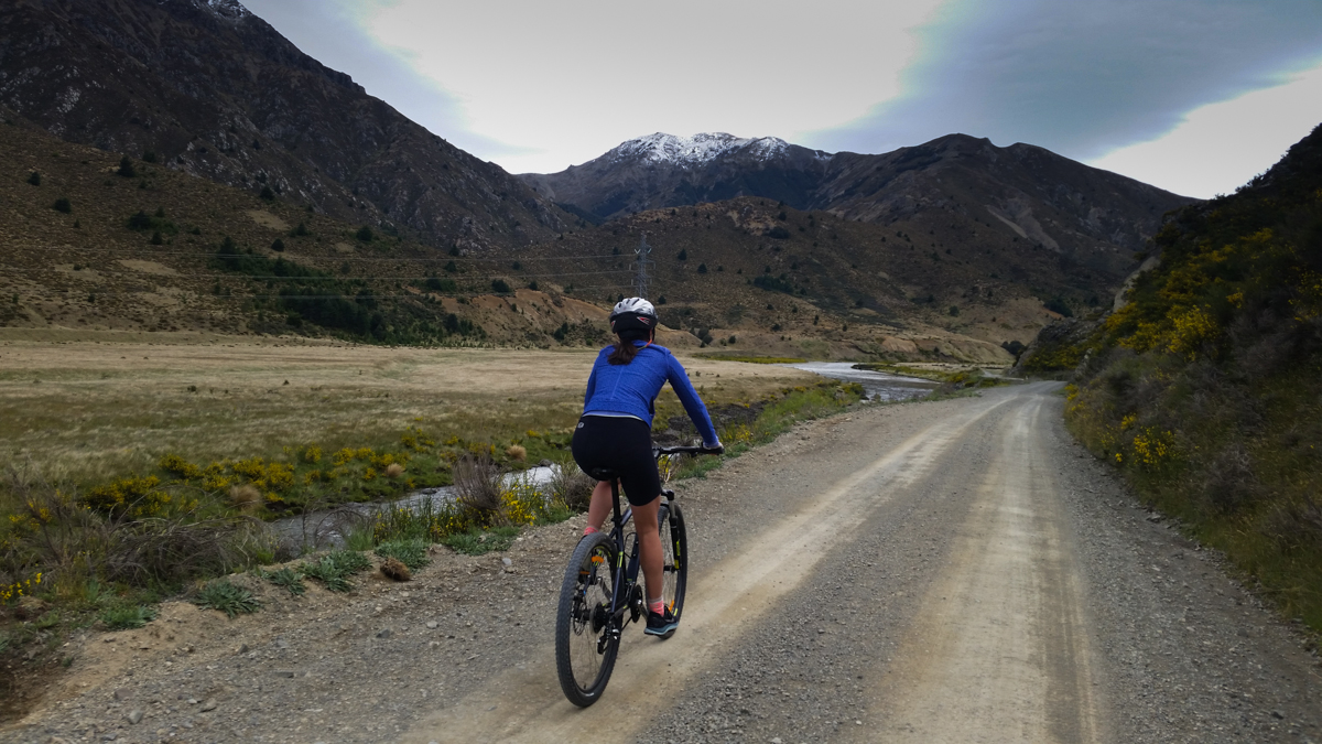Donna riding along the Clarence River in the high country behind the Hanmer Range