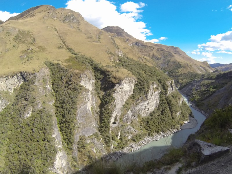 Looking down at the Shotover River through the bus window that was driving along a very sketchy old mining dirt road