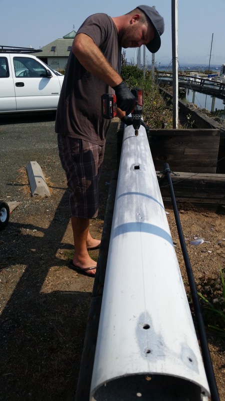 This is Joyous’ new boom, after we stripped off all the old hardware, sanded it, and began filling the old holes with epoxy filler.