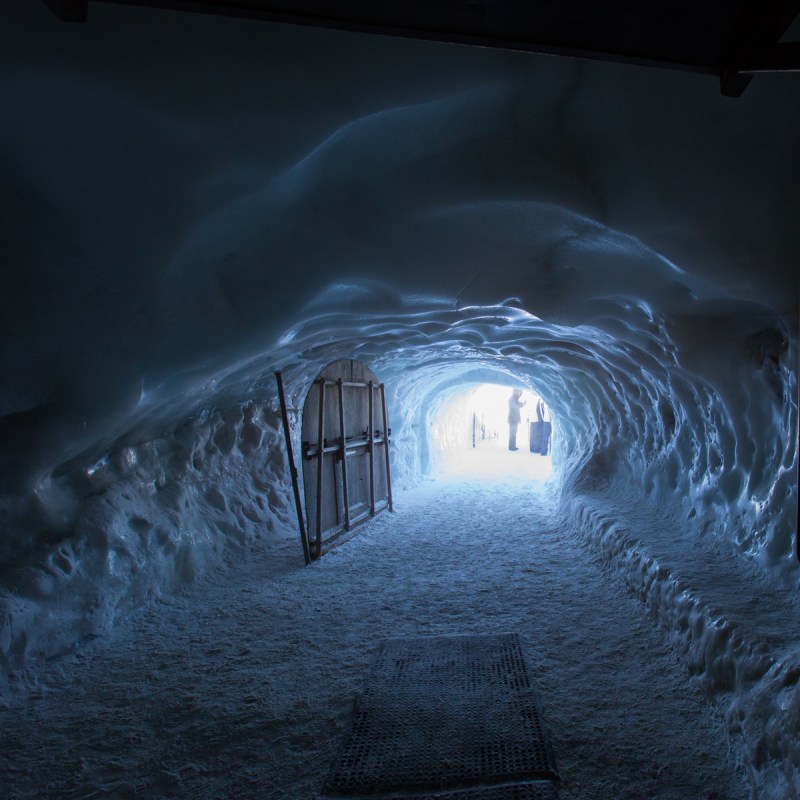 The famous tunnel that leads to the treacherous snow-walkway where you start the Valle Blanche run