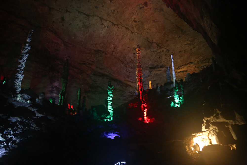 Stalagmites lit up by neon lights.